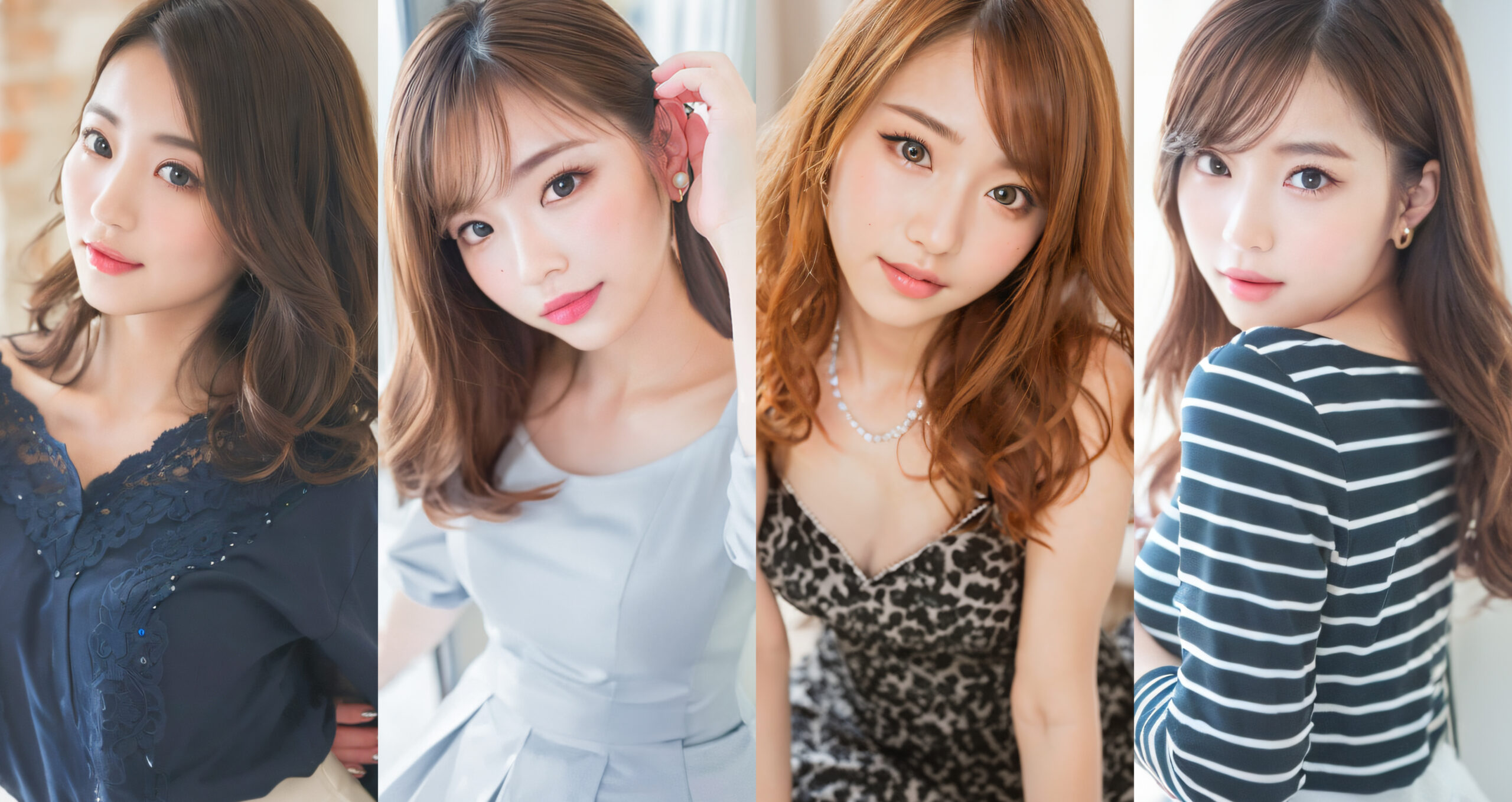 Uncategorized画像には背中を向けて振り返っているポーズを取る女性が写っています。彼女はネイビーとホワイトのストライプ柄のトップスを着ており、光沢のある茶色の髪が長く流れています。顔立ちははっきりしており、繊細なアイメイクとピンク色のリ...